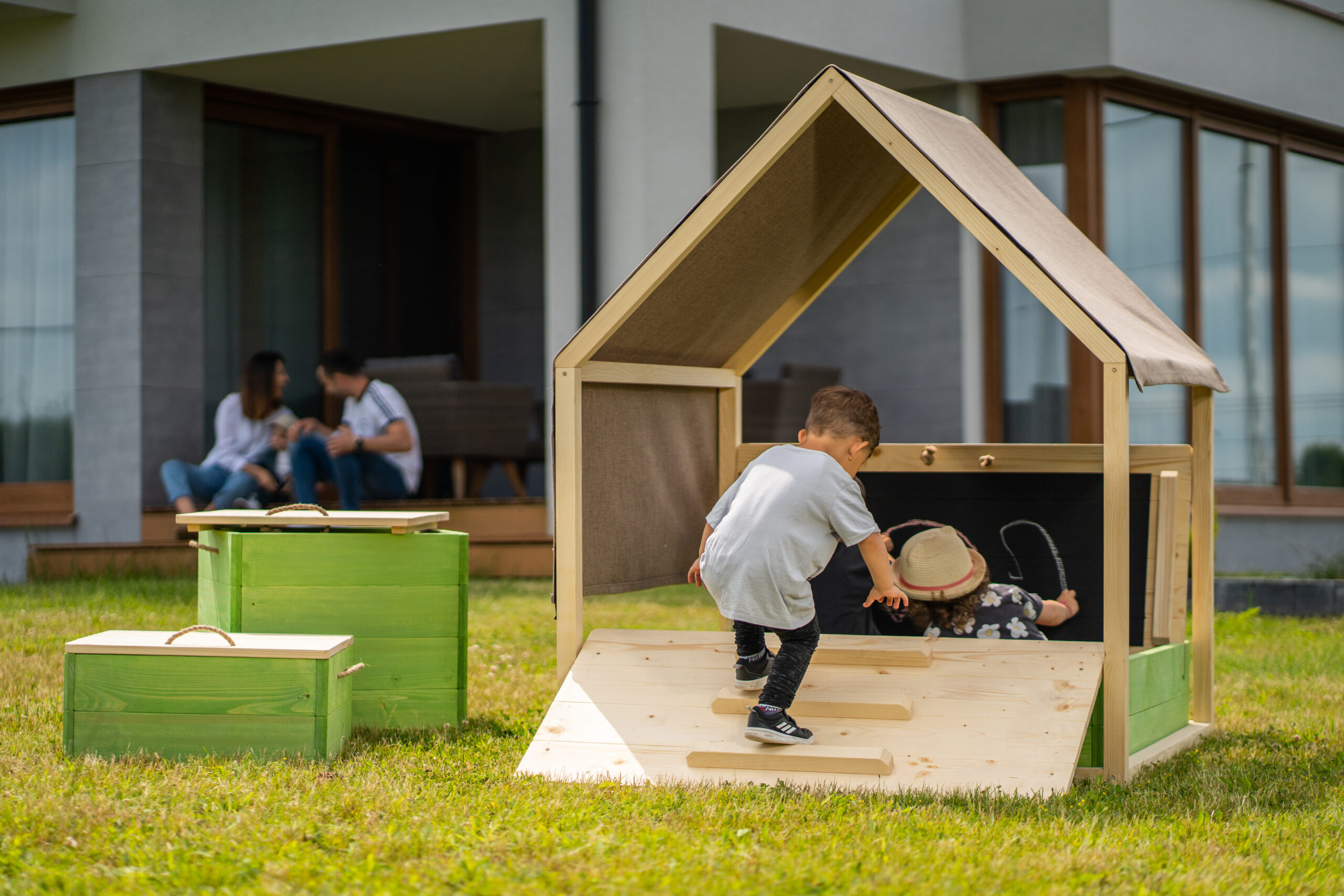 Dodatkowo możesz zamontować domek z daszkiem, który ochroni maluchy przed słońcem i da chwilę wytchnienia, gdy w pocie czoła tworzą swoje magiczne światy. Przygoda czeka!